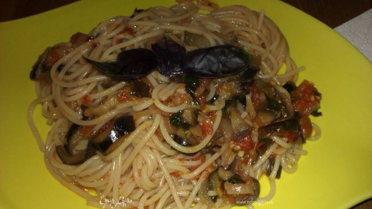 - Шаг 6Соединяем спагетти с баклажанами и томатным соусом. Перемешиваем, немного прогреваем, и подаем к столу, украсив листиками базилика. Приятного аппетита!