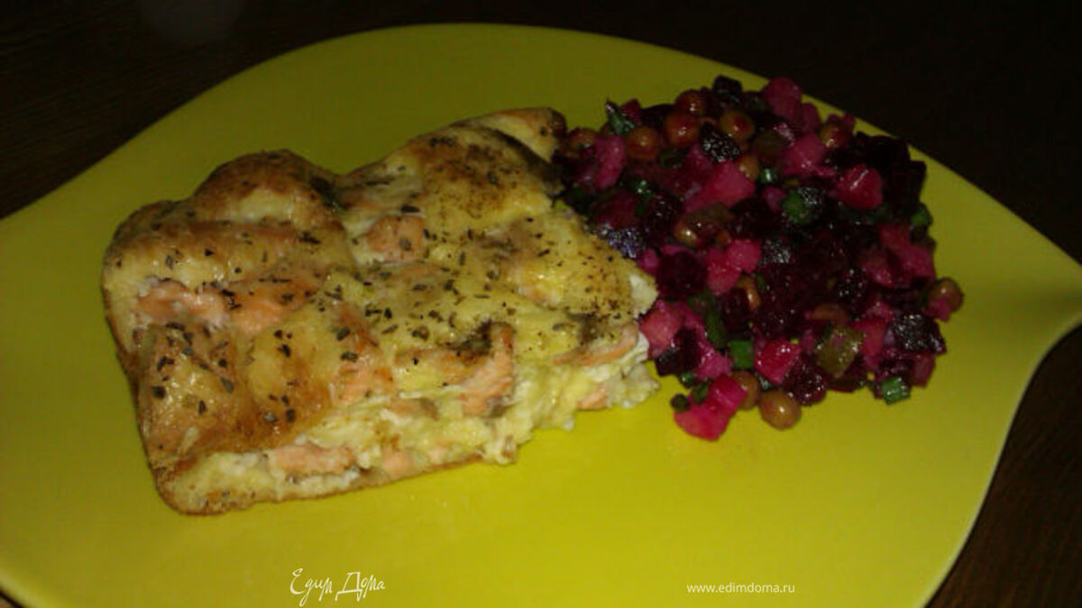 - Шаг 3Запекаем при температуре 150С в течение 40-50 минут. Пирог получается очень вкусным и нежным! Я подавала с винегретом. Приятного аппетита!