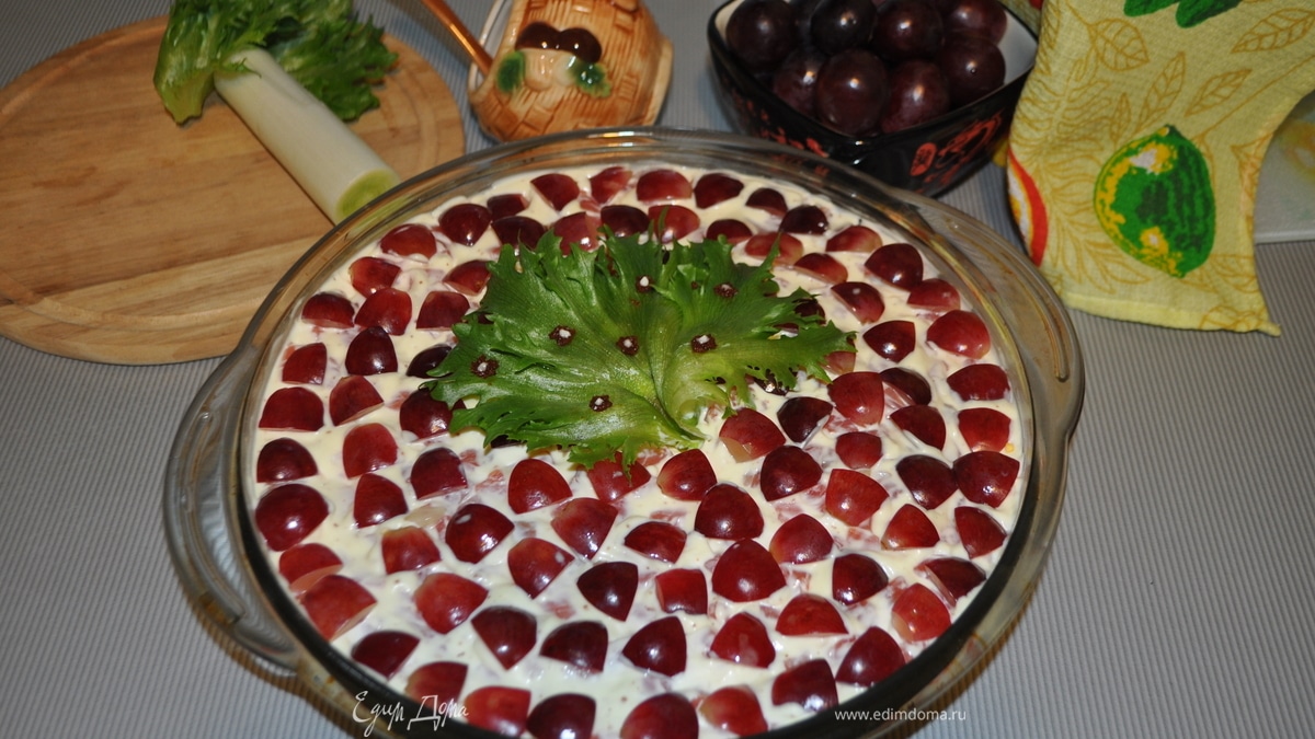 - Шаг 3И последним слоем нарезанная кусочками красная рыба, опять смазать соусом и выложить сверху виноградом.