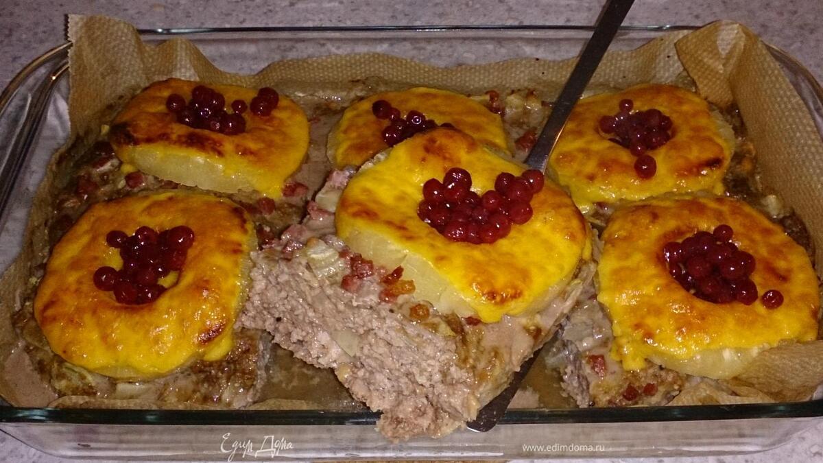 Мясная запеканка с ананасом, сыром и брусникой