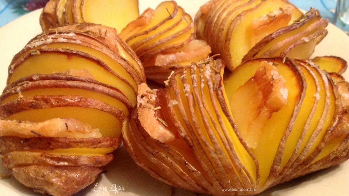 Картошку вымыли, вытерли насухо бумажным полотенцем, порезали, не доводя нож до конца, иными словами, надрезали. В каждую картошку вставили по 3 кусочка сала (в большую - 4 кусочка), посыпали солью и розмарином