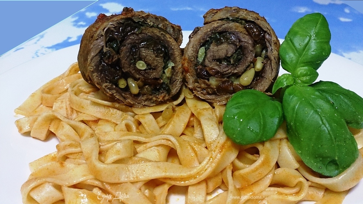 Рулеты посолить, поперчить. Тертый пармезан, рубленые петрушку, шнитт-лук и базилик, чеснок, орешки и изюм равномерно выложить на рулеты. Свернуть и закрепить либо кондитерской ниткой (у меня) либо зубочистками. - Шаг 3