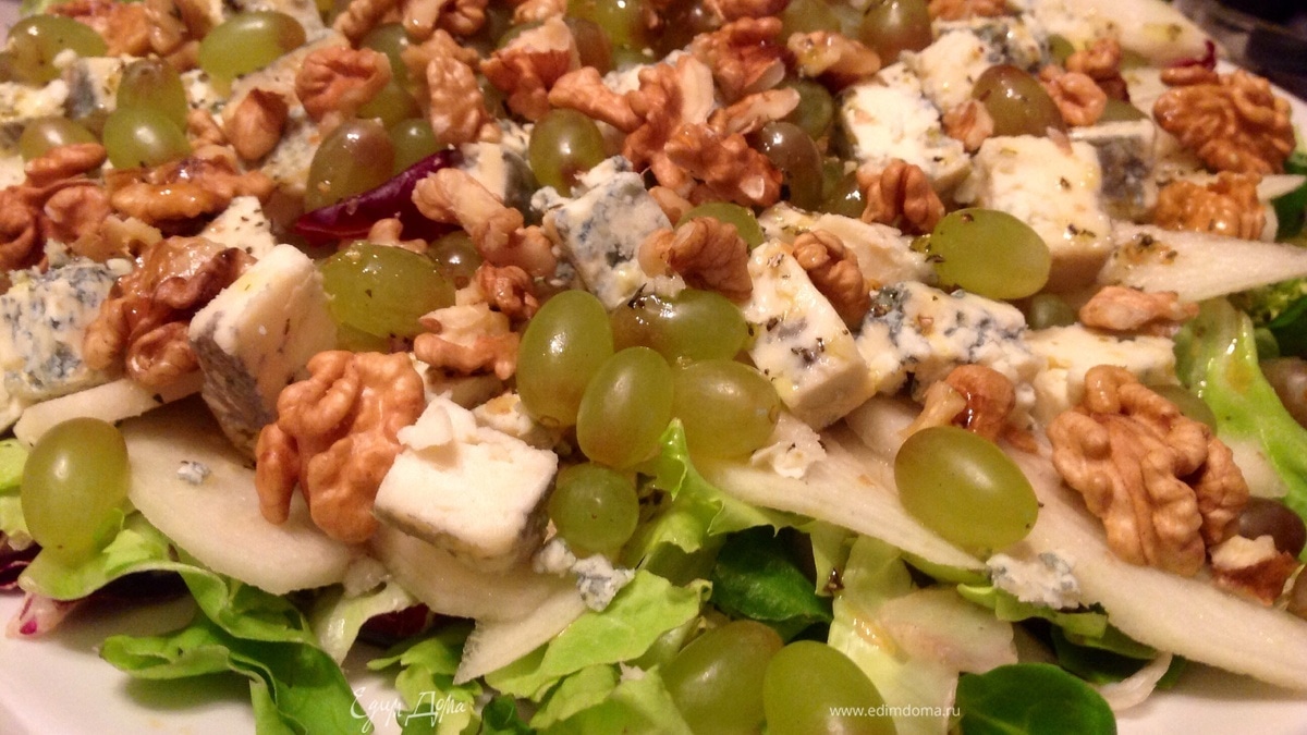 - Шаг 2Сверху груши выложили порезанный кубиками сыр с плесенью (голубой сыр). Сверху сыра - виноград без косточек, сверху винограда - орехи, и снова все это полили уже оставшейся заправкой. Ничего не солим, так как сыр соленый.