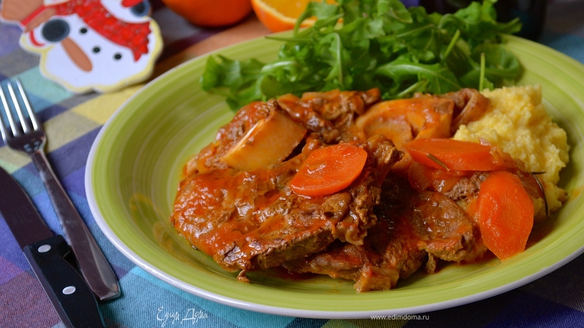 Оссобуко - классическое итальянское блюдо из телячьей голяшки, нарезанной поперек кусками толщиной около 5 см. При такой разделке мяса, в голяшке остается кость с костным мозгом внутри, которая и дала название всему блюду ; оссобуко - "дырявая кость"! ))) В данном блюде, которое я позаимствовала у Белоники, сочетание мяса и сладости апельсина придает мясу по-настоящему праздничный вкус!
