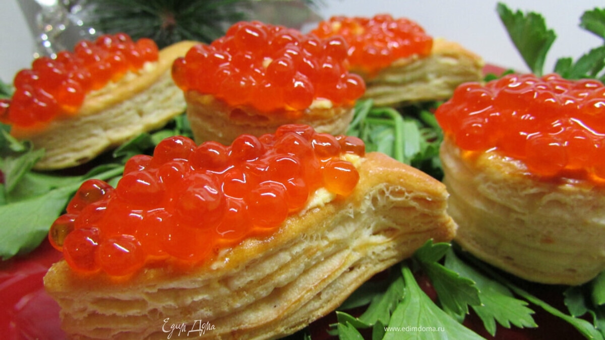 Сверху украсить крем красной икрой. Выложить тарталетки на тарелку, украшенную зеленью петрушки или укропа. Приятного аппетита!