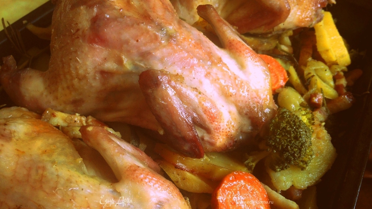 Маринованные в вине перепела, запеченные с овощами и беконом