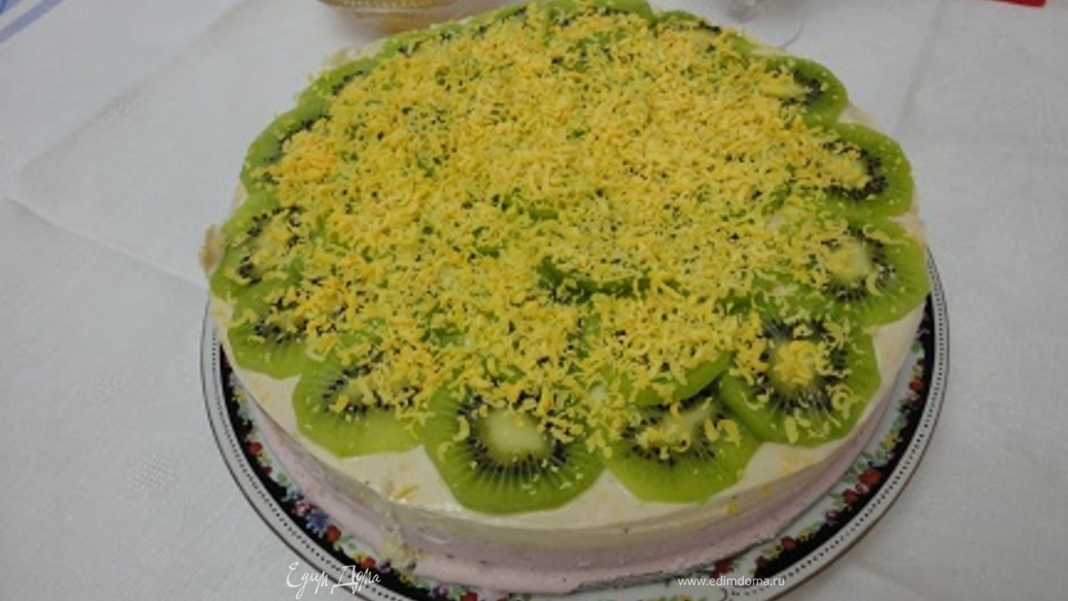 На почти застывшую начинку выложить «чешуйкой» кусочки киви и посыпать тертым шоколадом (у меня он был с апельсиновым вкусом).