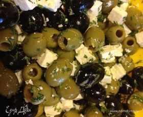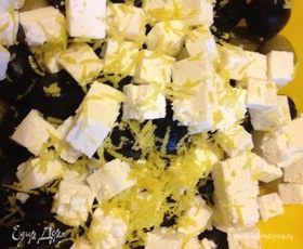 Нарезать кубиками фету, натереть цедру лимона, добавить чеснок гранулированный (я потерла 2 маленьких зубчика чеснока), сбрызнуть лимонным соком, добавить оливковое масло. Все хорошо перемешать.