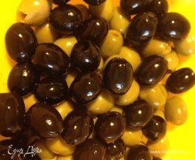 Подготовить контейнер с крышкой, в него выложить оливки зеленые и черные.
