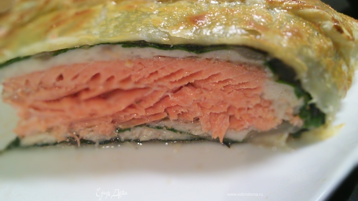В этом разноцветном рулете два вида рыбы: красная и белая, а ещё зелёные листья мангольда. Все в одном оригинально смотрится, на вкус нежно, сочно и не скучно. Этот рулет сложно даже рулетом назвать, скорее пирогом, т. к. лососевая форель мне попалась гигантская. Но я оставила всё как есть, ведь не факт, что и Вам достанется