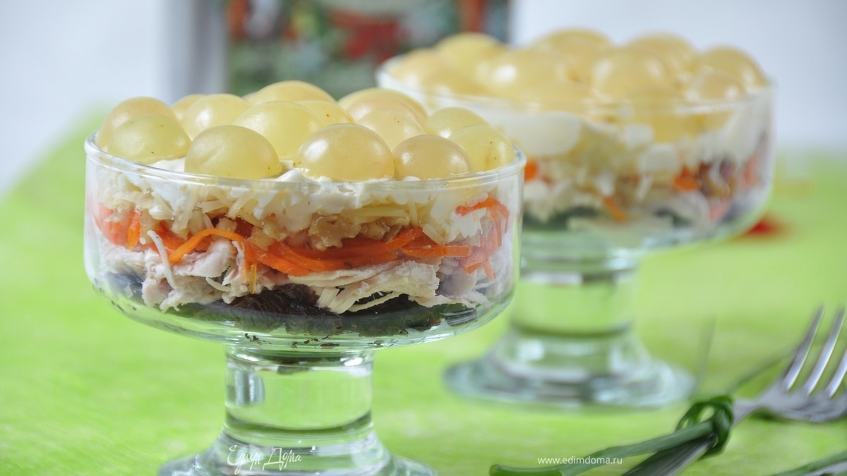 Полностью промазываем верх майонезом и украшаем половинками винограда. Угощайтесь!