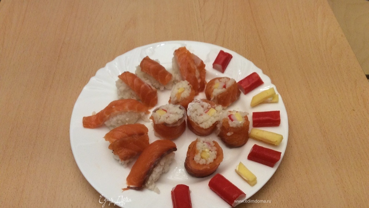 Домашние суши. Увидел на тарелке и сразу будто перенесся на тысячи километров в Токио. Но я успел сфотографировать только готовое блюдо: домочадцы чуть не съели ингридиенты.