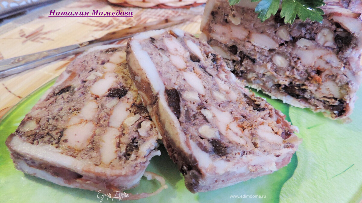В своем террине я соединила все, что моя семья очень любит: свиной фарш с жаренным луком, маринованное куриное филе, чернослив и грецкие орехи. На мой взгляд, сочетание получилось очень удачным и, несомненно, праздничным