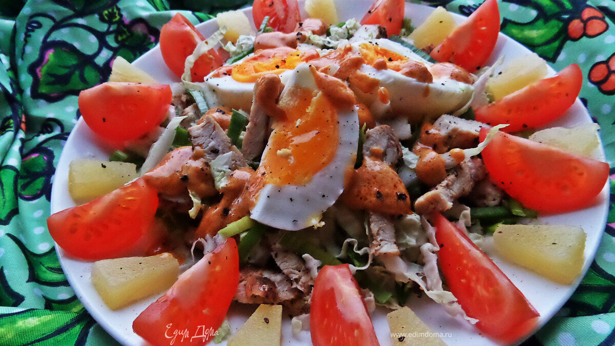 Раскладываем курочку ,капусту с луком горкой на тарелке. Яйца отварим минут 5, остудим и разрежем на дольки.
