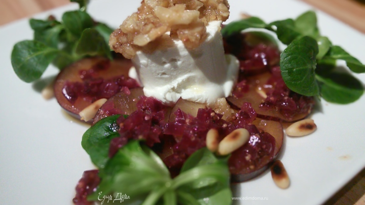 Козий сыр, запечённый под ореховой корочкой на сливовом карпаччо