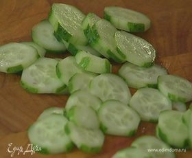 С огурцов срезать вдоль часть кожицы, чтобы получились полоски, и нарезать поперек кружками.