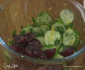 Виноград разрезать на 4 части (удалить косточки, если они есть) и добавить к огурцам с зеленью.