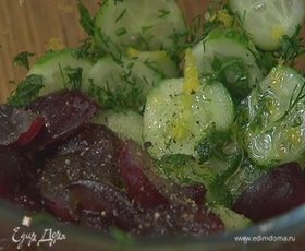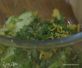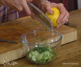 Приготовить салат: огурцы соединить с мятой и укропом, посолить, добавить 1 ч. ложку цедры лимона, влить 1 ст. ложку лимонного сока, все перемешать и дать салату немного постоять.