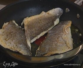Разогреть сковороду, выложить рыбу кожей вниз, еще немного посолить, поперчить, сбрызнуть маслом и обжаривать по 2‒3 минуты с каждой стороны — рыба должна быть готова, но не пересушена!