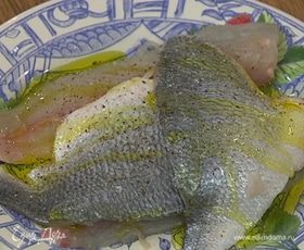 Филе дорады посолить, поперчить и сбрызнуть оливковым маслом.