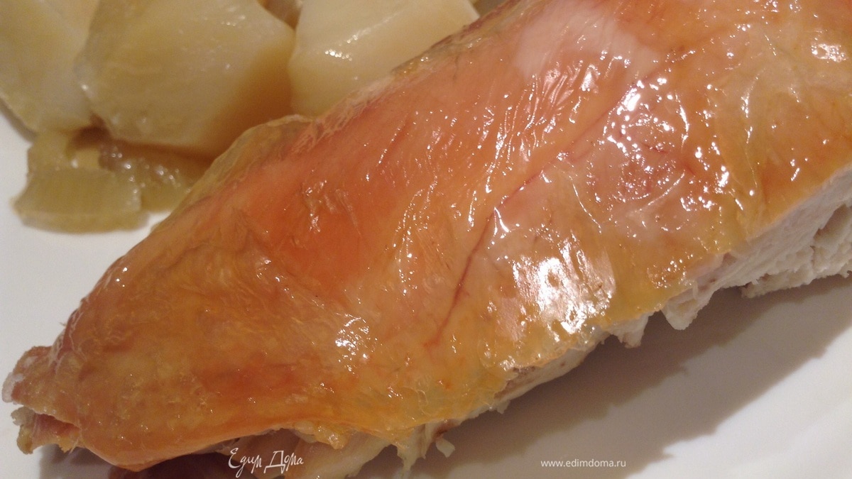 Накрыть крышкой и выпекать 1 ч. 30 мин. при 200*С. Открыть крышку и запекать еще 30 минут (поливая курицу жидкостью, которая образуется на дне формы).