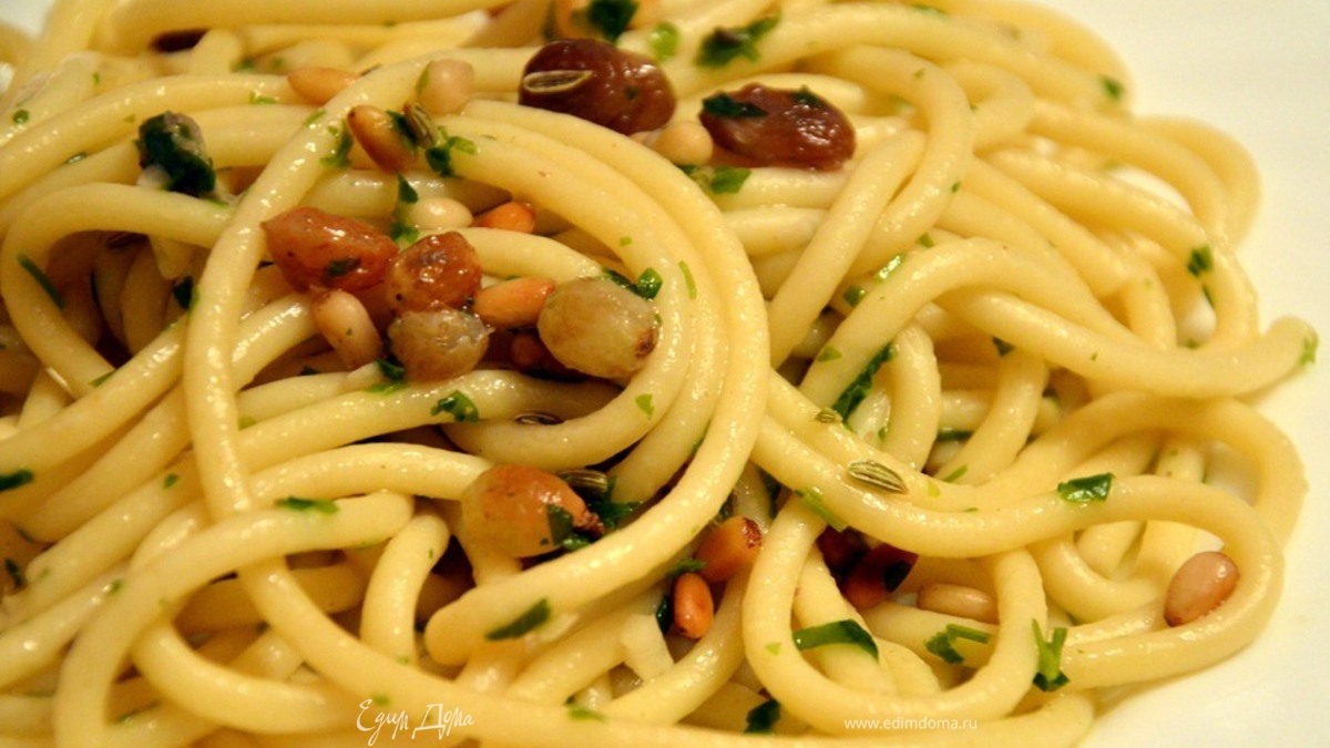 - Шаг 2Варим пасту в большом количестве кипящей, подсоленной воды.Сливаем, оставляя 1/2 стакана воды от варки, и добавляем пасту в сковороду с соусом. Сливаем воду из изюма и добавляем изюм в сковороду. Теперь делаем огонь сильным и добавляем в сковороду воду от варки пасты. Перемешиваем смесь, пока большая часть воды испарится и соус как следуем смешается с пастой (на это уйдет около 3-х минут). Посыпаем кедровыми орешками. Подаем сразу же.
