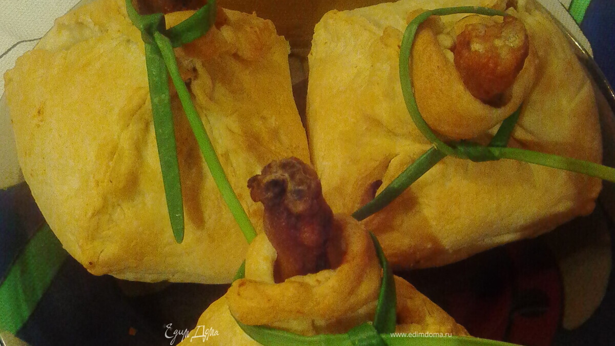 Мягкое тесто делим на квадраты 15x15 см. В центр каждого кладем 1 столовую ложку с горкой картофельного пюре. Сверху на него ставим ножку косточкой вверх. Уголки теста поднимаем и защипываем по бокам между собой и прижимаем плотно к косточке. Для уверенности (по желанию) можно зафиксировать ниткой, как бы завязывая мешочек. Даём минут 20 на расстойку. - Шаг 3