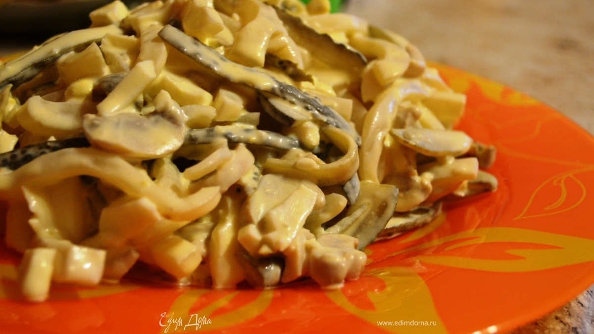 Салат получается сочным, нежным! В оригинале рецепта, который я вам представила, нет маринованых грибов, но я немного добавила (т.к. просто они завалялись у меня в холодильнике). Из данного количества продуктов получается весьма приличная порция салата. Прияного аппетита!