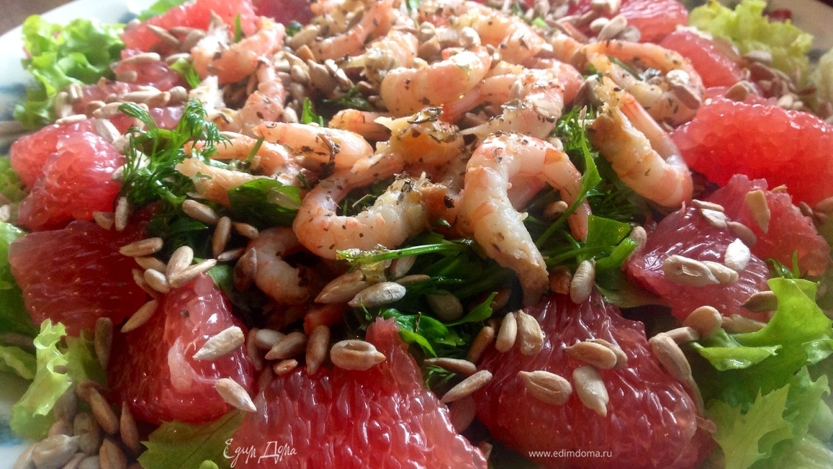 Креветки добавили в миску к порезанному салату, грейпфрут очистили от пленки и порезали на порционные кусочки.