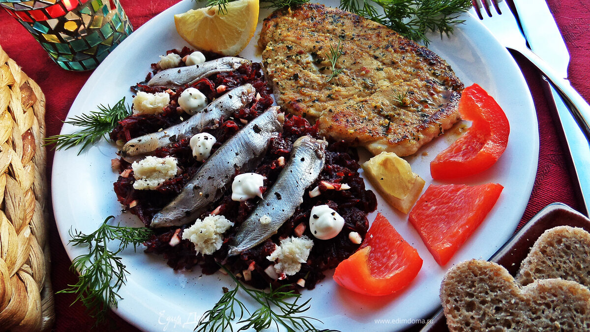 На тарелку кладём филе, рядом свекольный гарнир, украшаем килечкой (анчоусами), каплями сметаны или майонеза, а также хреном.