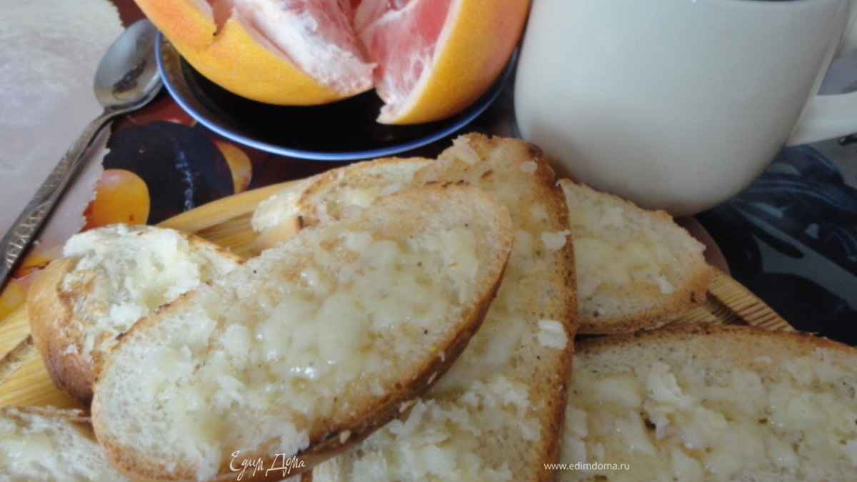 Багет нарезать ломтиками и слегка обжарить на сухой сковороде. Ломтик чеснока надрезать и натереть им каждый ломтик багета. - Шаг 1