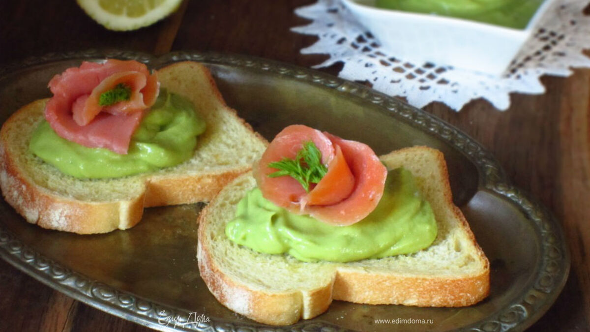 На ломтики хлеба выложить массу из авокадо и ломтики лосося. Приятного аппетита:)