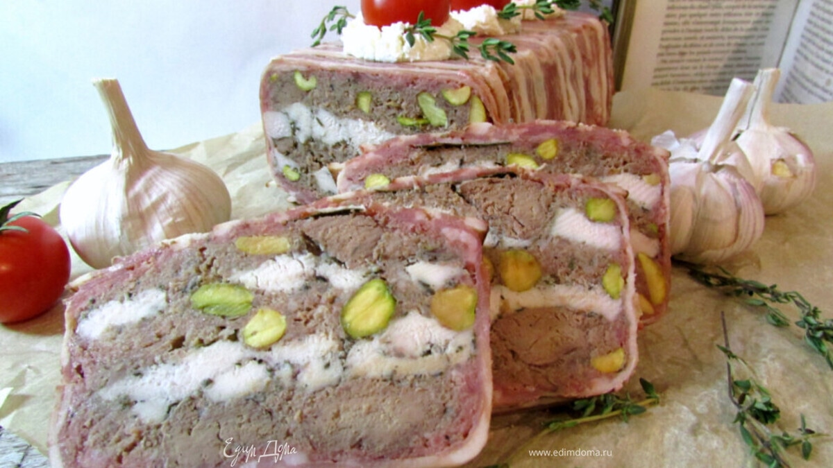 Снять гнёт, перевернуть террин на блюдо и нарезать ломтиками. Приятного аппетита!