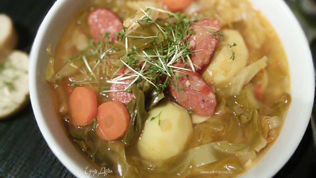 Пусть за окном метет метель или идет холодный зимний дождь, мы насладимся зимой кулинарным образом — согреемся насыщенным горячим супом, который я вам сегодня предлагаю. Такой супчик сэкономит вам время и накормит всю вашу семью, включая детишек, потому как колбаски у них очень популярны.