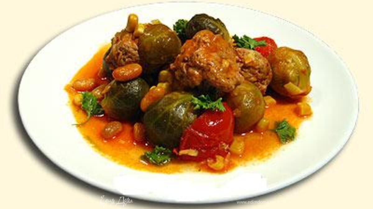- Шаг 1# Лук и чеснок очистите, измельчите и слегка обжарьте на масле. # Перемешайте с молотым мясом, посолите и поперчите. # Сделайте из мясного фарша небольшие шарики и обжарьте их со всех сторон. # Положите тефтели в кастрюлю и залейте их бульоном. # Если вы используете свежую брюссельскую капусту, вымойте ее, почистите, надрежьте крест-накрест в кочережке и варите в подсоленной воде 15 минут. Добавьте в воду щепотку соды, чтобы капуста сохранила цвет. Потом отбросьте на сито, чтобы стекла вода. # Добавьте в кастрюлю с тефтельками измельченные консервированные томаты с соком, и тушите на маленьком огне 10 минут. Потом добавьте замороженную или свежую сваренную капусту. # Положите в кастрюлю кукурузу и фасоль. Подержите на огне в течение 5 минут, если нужно, приправьте солью и перцем. # Украсьте зеленью.