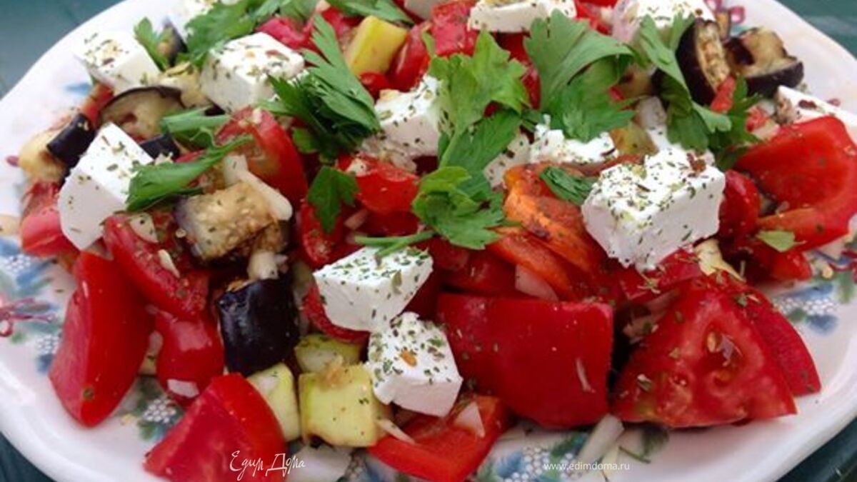 - Шаг 2Сыр фета режем на кубики, выкладываем сверху овощей и посыпаем итальянскими или прованскими сухими травами. Поверх салата свежая петрушка.