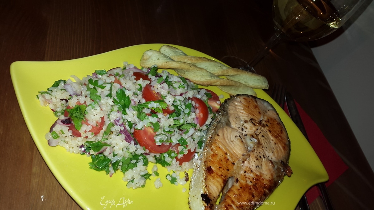 Жареный лосось с гарниром из кускуса с черри и красным луком
