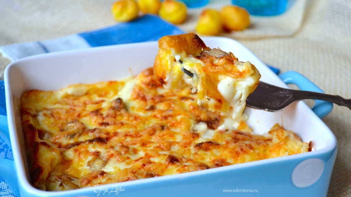 Посыпать тертым сыром Эмменталь. Выложить сверху несколько маленьких кусочков сливочного масла. Поставить в разогретую до 220°C духовку на средний уровень минут на 20-25 до появления золотистой корочки. Следить по своей духовке! - Шаг 13