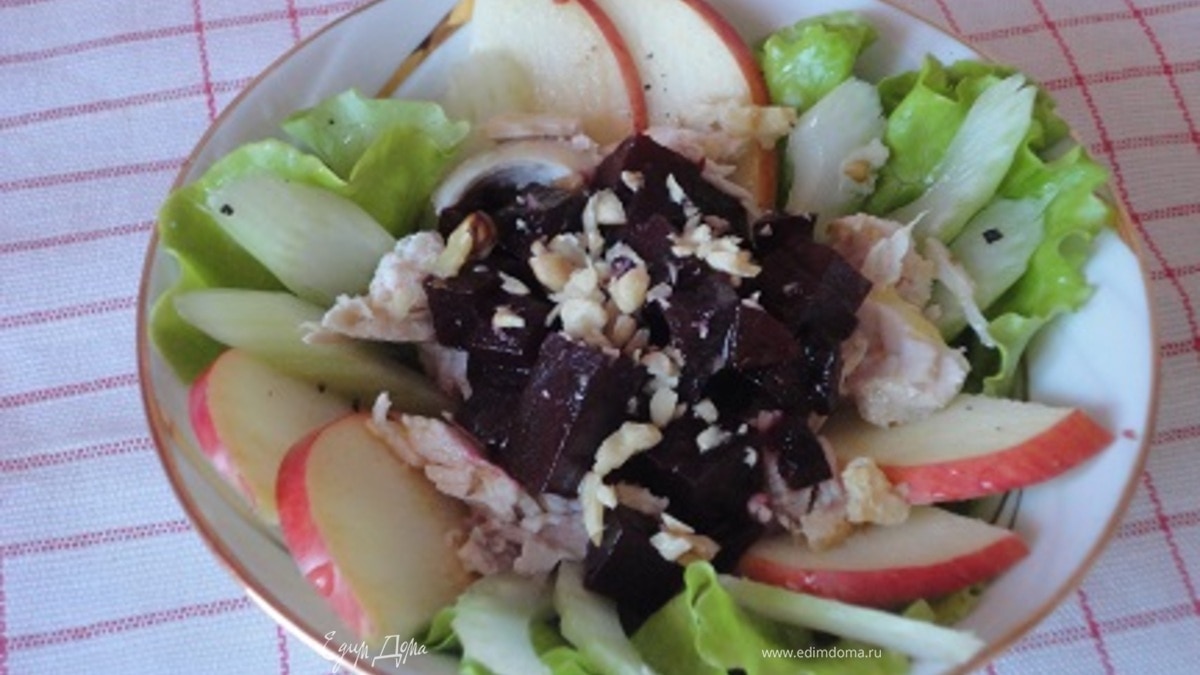 Выложить мясо, нарезанное мелкими кубиками, сверху свеклу. Полить смесью лимонного сока, оливкового масла, соли, перца и сахара. Сверху посыпать орехами.