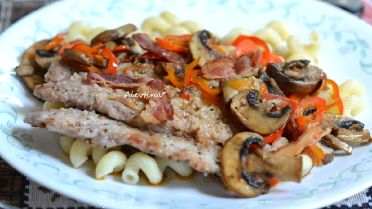 Подавать скалопини с готовым гарниром и грибами со сладким перцем. Приятного аппетита.