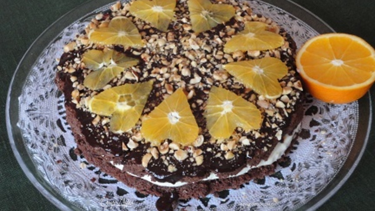 Шоколадный корж разрежьте вдоль на две половины. Коржи без муки, поэтому очень хрупкие. У меня они разломились, но я их аккуратно сложила. Нижний корж смажьте кремом, накройте вторым . Растопите оставшийся шоколад со сливочным маслом на водяной бане, добавьте мед, перемешайте, полейте торт глазурью и посыпьте фундуком. Можно украсить вот такими апельсиновыми сердечками. - Шаг 5