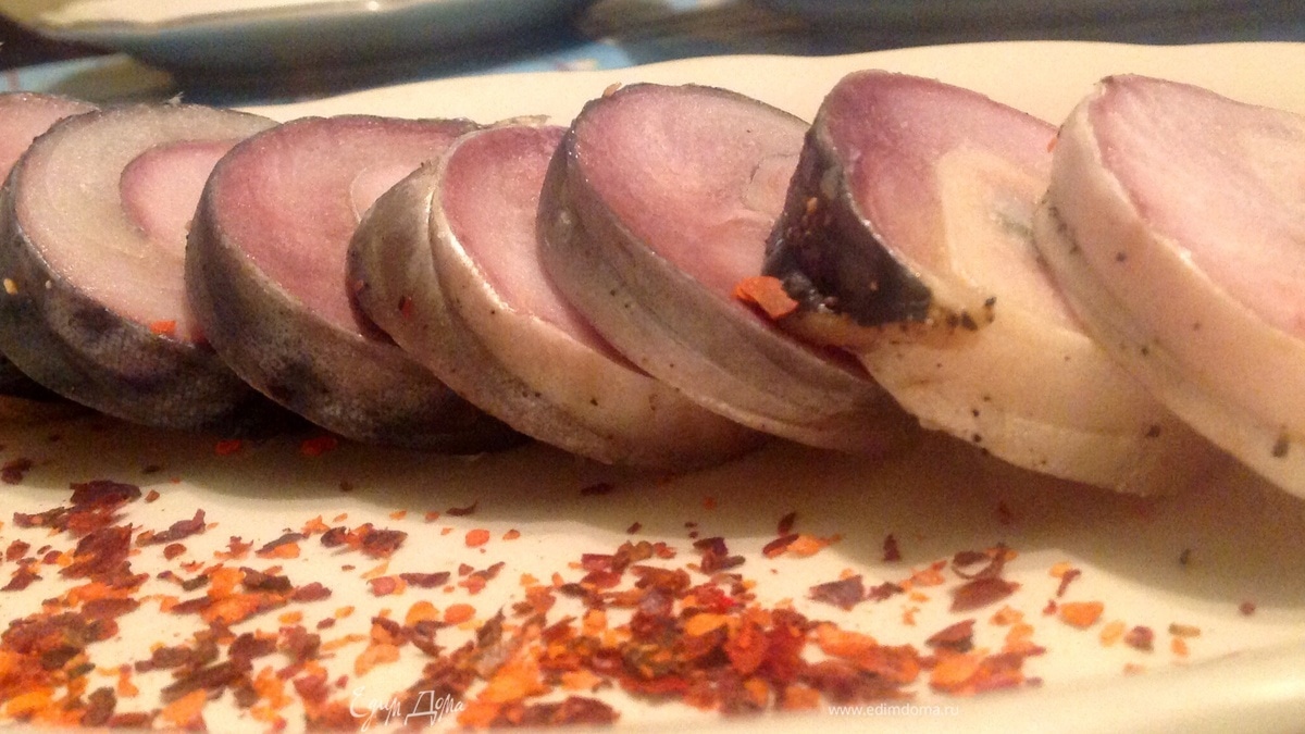- ПодготовкаСкумбрию разрезаем по спинке, не по животу! Вынимаем хребет, вычищаем ее и промываем, даем стечь и вытираем хорошо бумажным полотенцем. Раскладываем тушки на доске, втираем со всех сторон соль (1 чайная ложка на одну небольшую скумбрию), также втираем перец. Лавровый лист разрываем на кусочки и выкладываем эти кусочки вдоль середины рыбы.