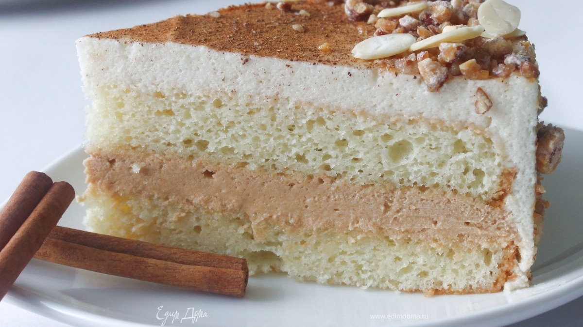 Для сборки торта выложить бисквитный корж, сверху на него выложить весь карамельный крем, затем еще один корж, а сверху яблочное пюре. Готовый торт поставить в холодильник на 4-6 часов. Торт можно украсить молотой корицей, орешками или дольками яблок.