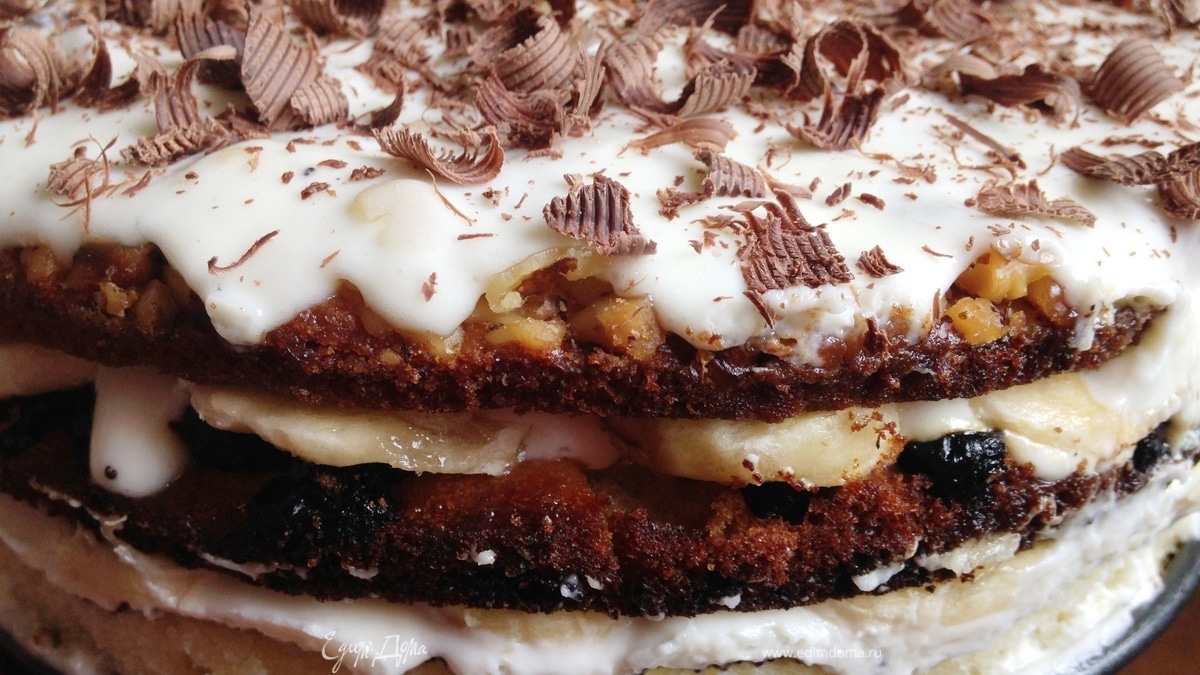Далее 2й корж (у меня изюм), распределить 2ю часть крема и сверху выложить кружочки банана. Затем 3й корж и на него остатки крема (или же оставьте немного для обмазки боков). Поставить торт в холодильник на ночь для пропитки. Утром снять кольцо формы и украсить торт по желанию (у меня порезанный овощечисткой шоколад). - Шаг 9