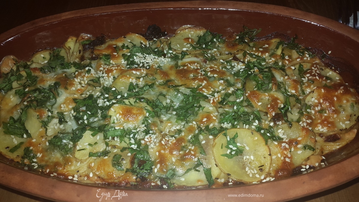 Картофель, запеченный с моцареллой, вялеными томатами и кунжутом