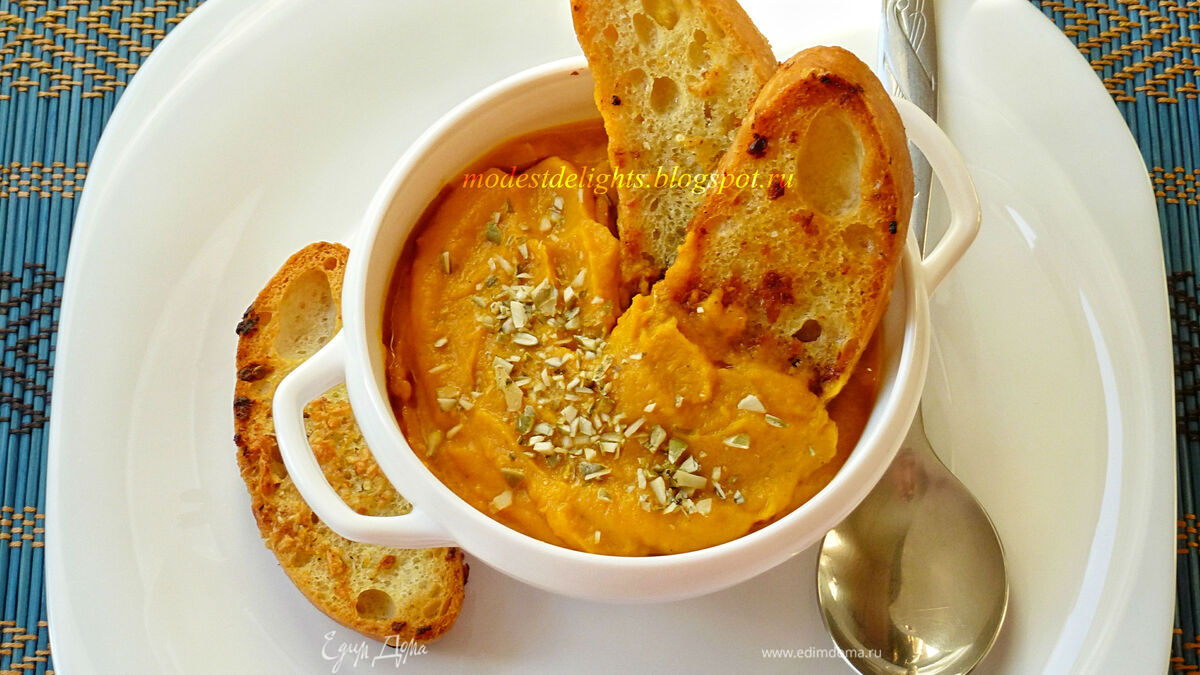 Прямо на гренки выкладываем суп. Присыпаем тыквенными семечками. Наш ужин готов! Суп получается густой, поэтому его можно есть не ложкой, а прямо гренками. Приятного аппетита!