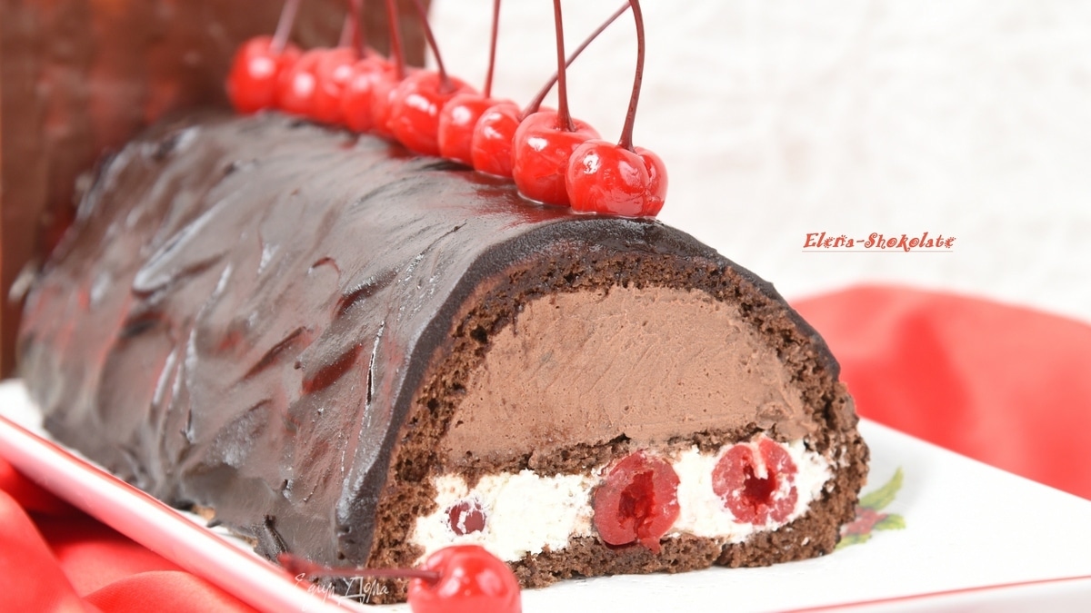Лёгкий бисквит, шоколадный мусс и взбитые сливки со сладкой вишней под глазурью из темного шоколада. Всё как я люблю. Сам рулет готовится быстро, только с оформлением повозилась. Не очень довольна как смотрятся шоколадные пластины (это был мой эксперимент