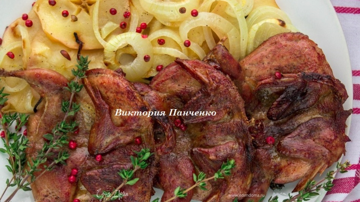 Запеченные перепела на яблочно-луковой подушке