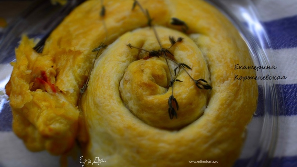 Свернуть рулет в виде спирали. Смазать оливковым маслом и запечь в духовке при Т 180 градусов до золотистой корочки.