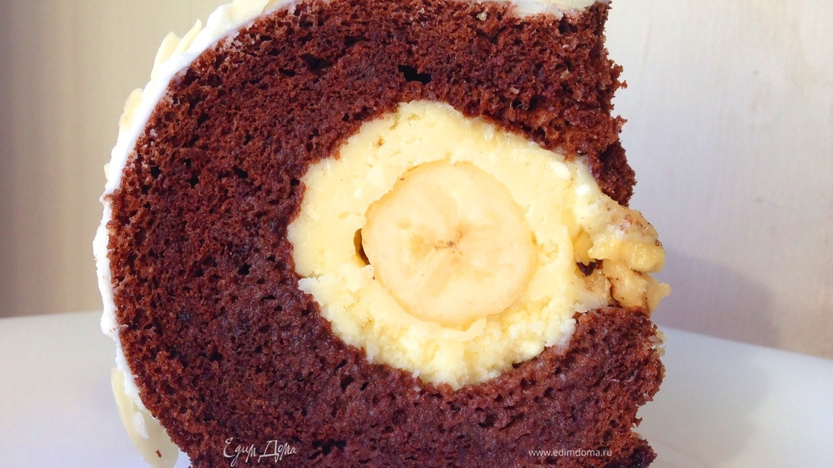 Заполнить бисквит кремом, в центр положить очищенный банан. Присыпать орехами. - Шаг 8